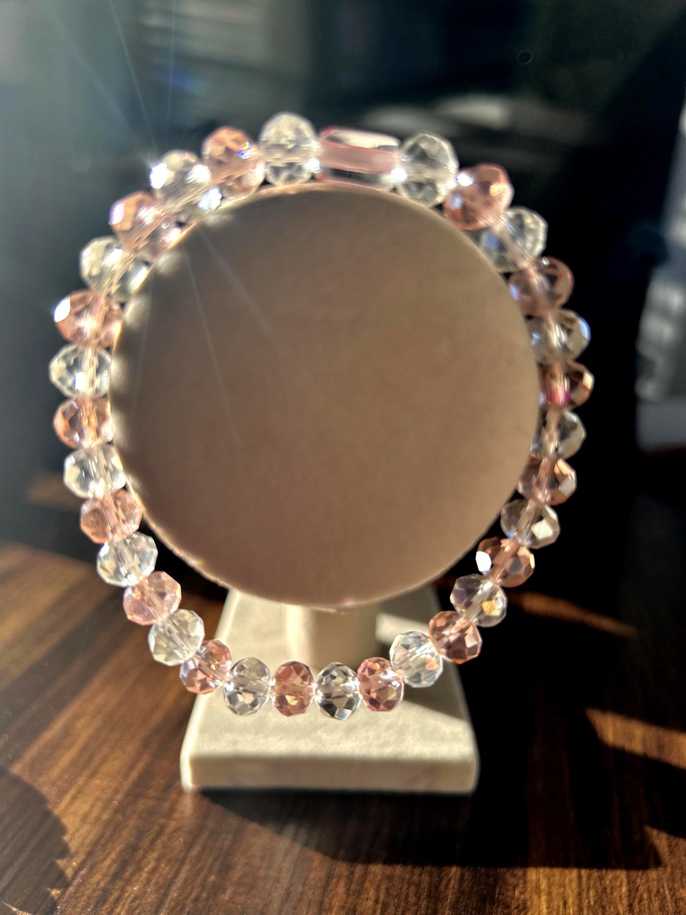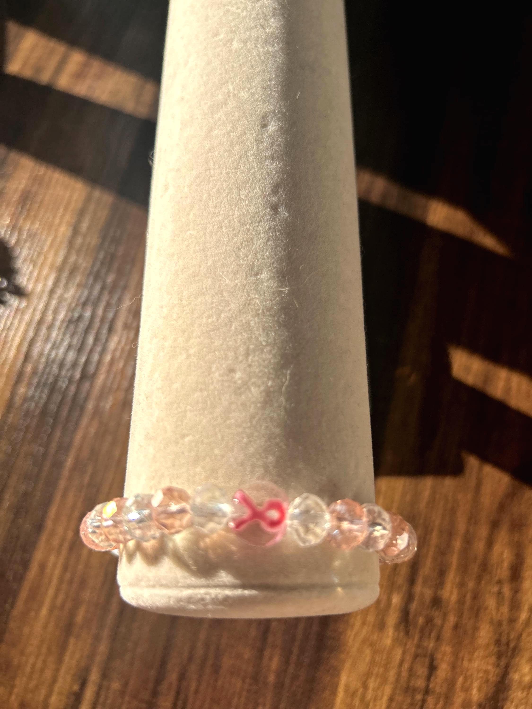 Elegant breast cancer beaded bracelet. Made with a breast cancer ribbon glass bead, clear glass beads and soft pink glass beads. A nice gift or way to honor/remember those who have fought the battle. Stay strong!!!!