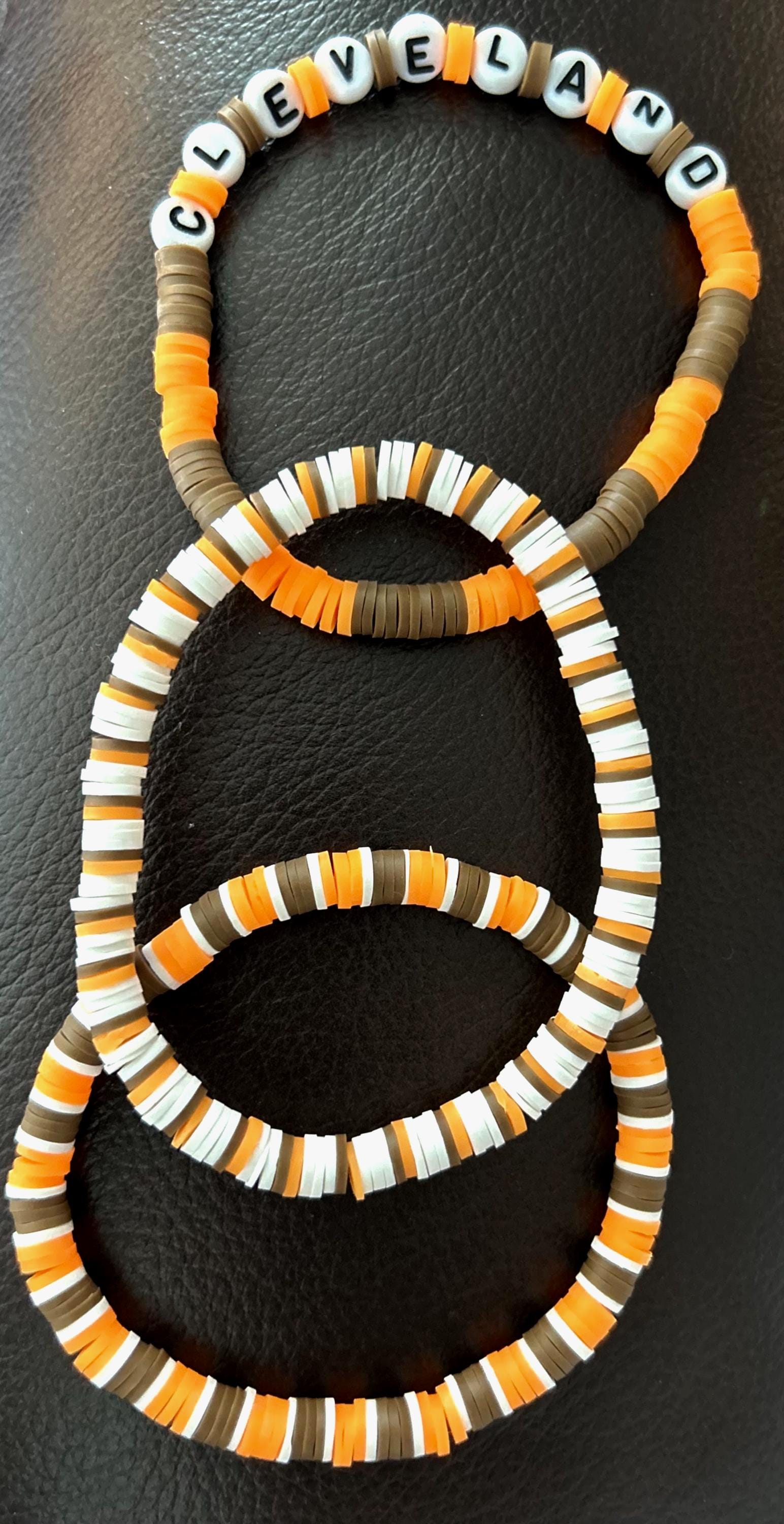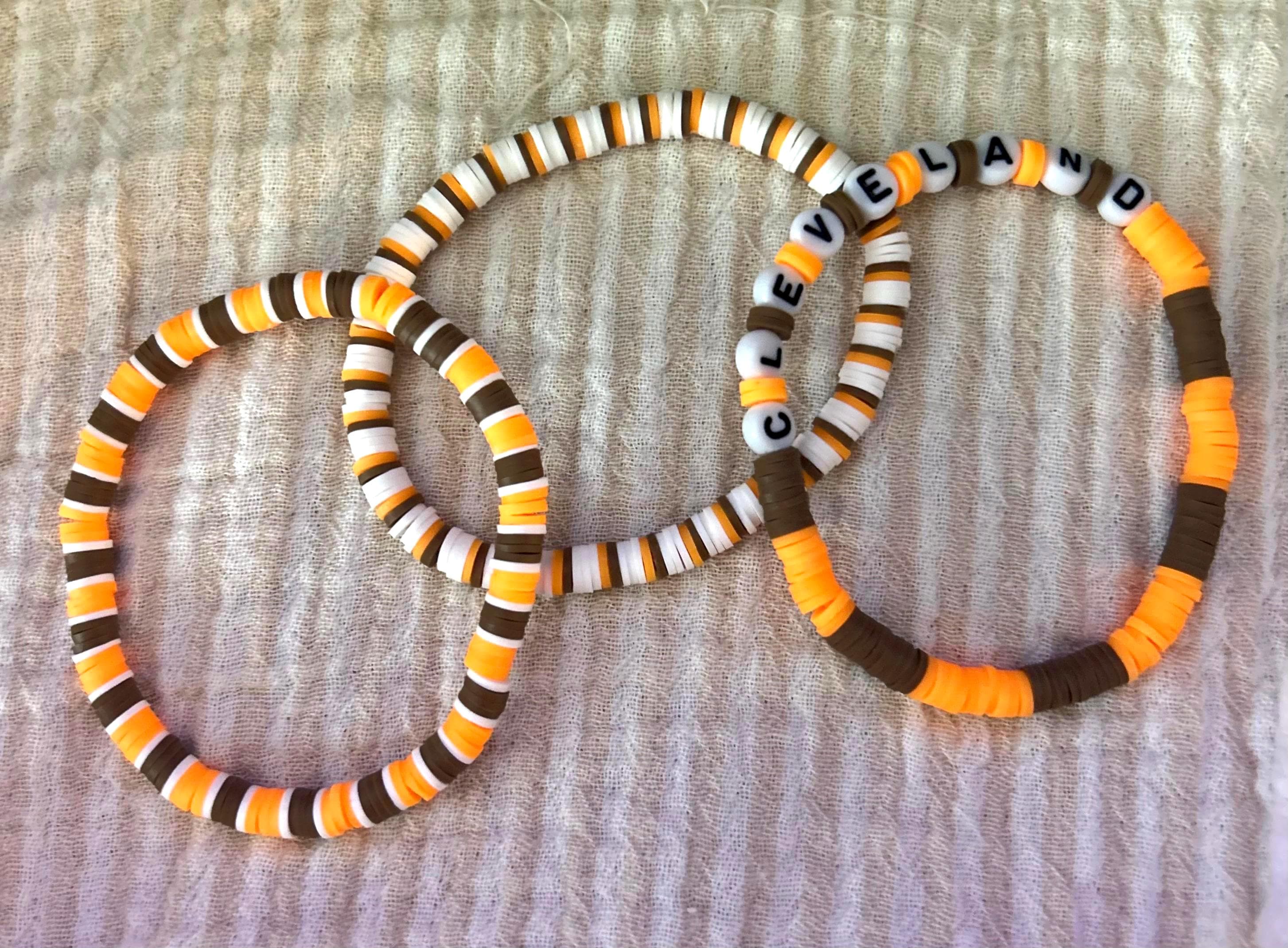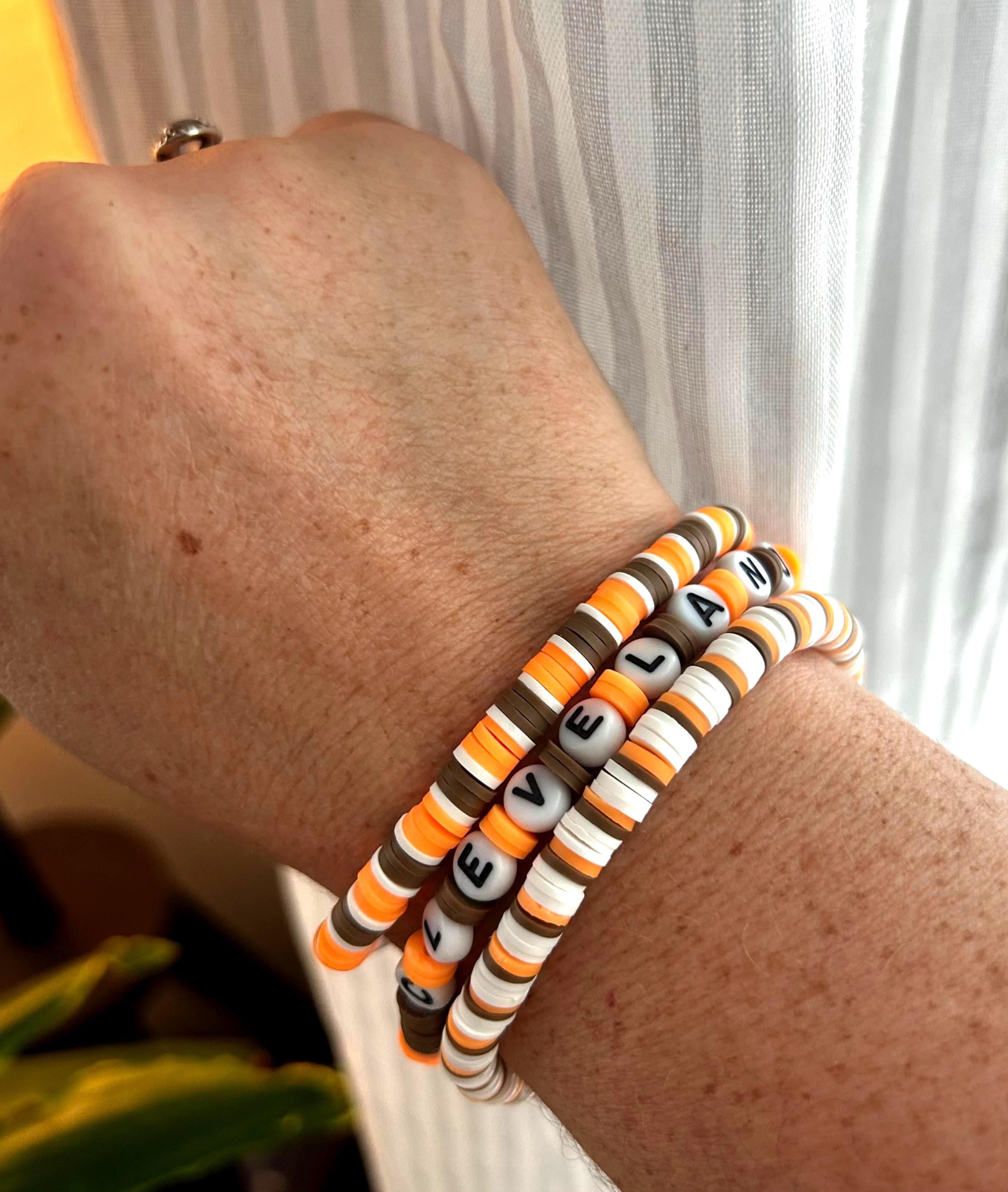 Handmade comfortable beaded bracelet set. Pictures show a 7 inch loose fit. Made with Heishi beads, plastic letter beads and strong elastic string. Makes a great gift or something fun to add to your stash!