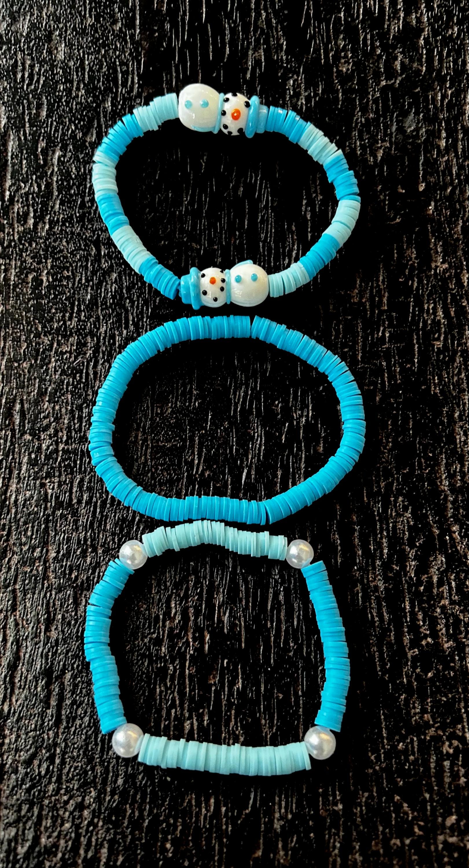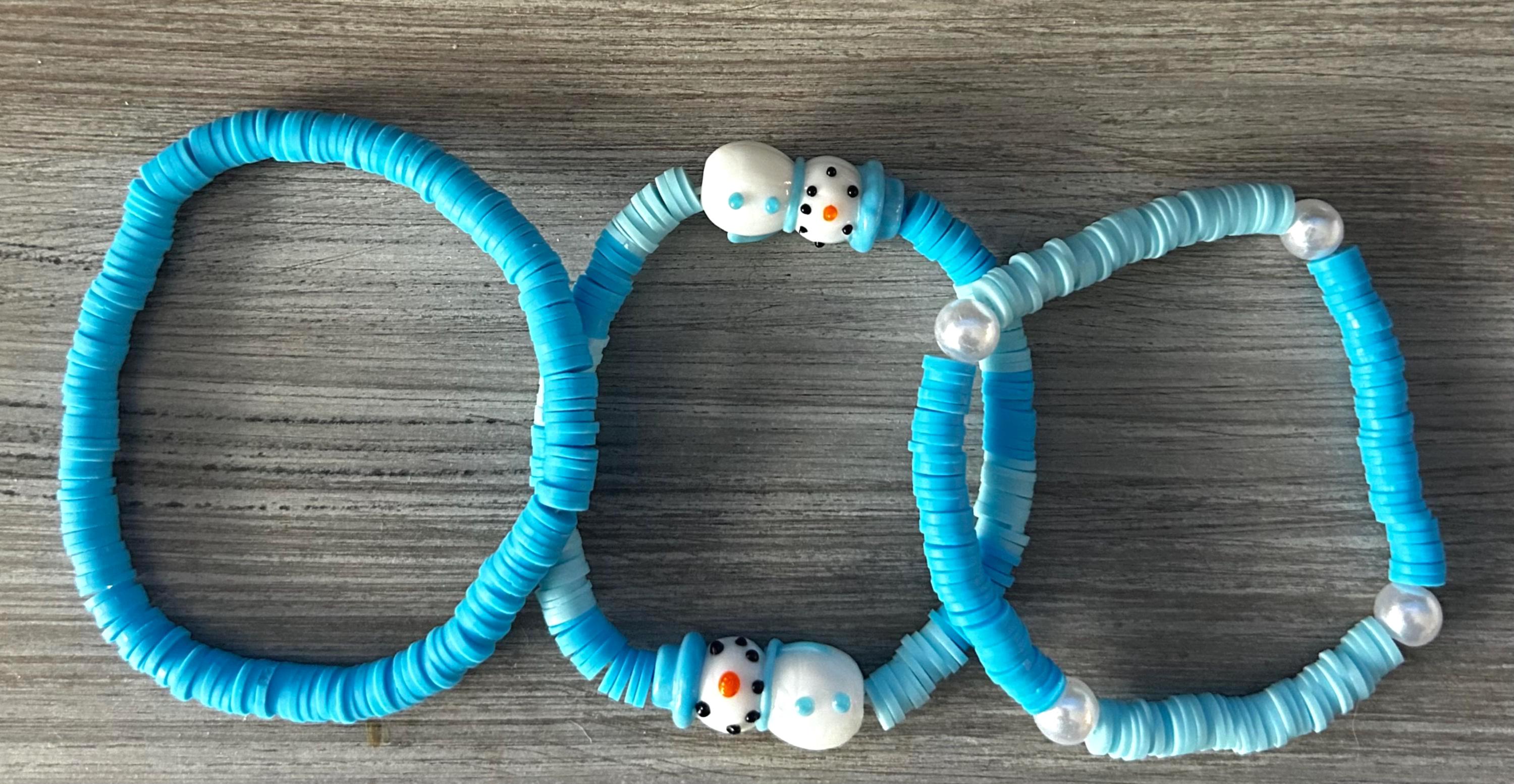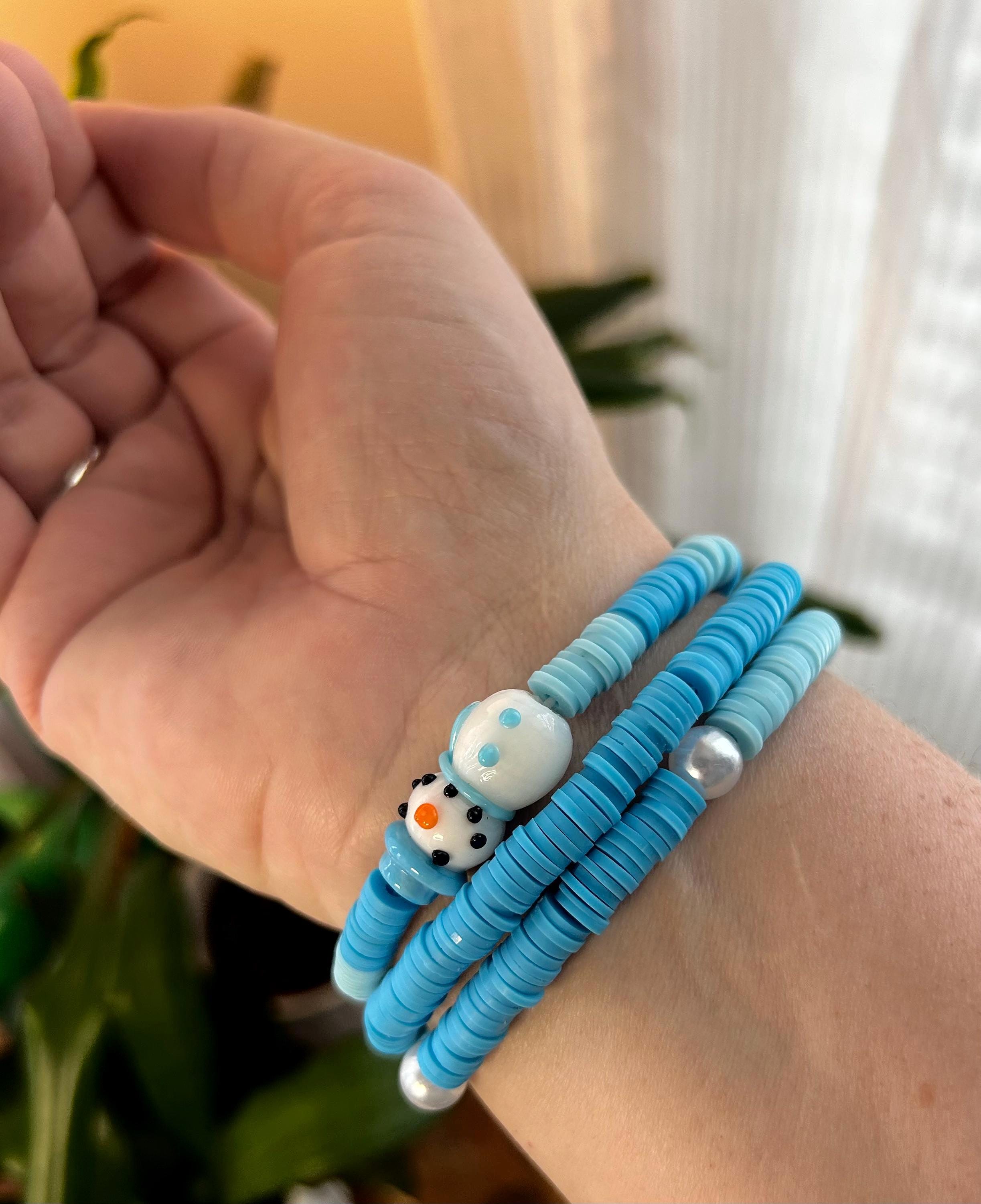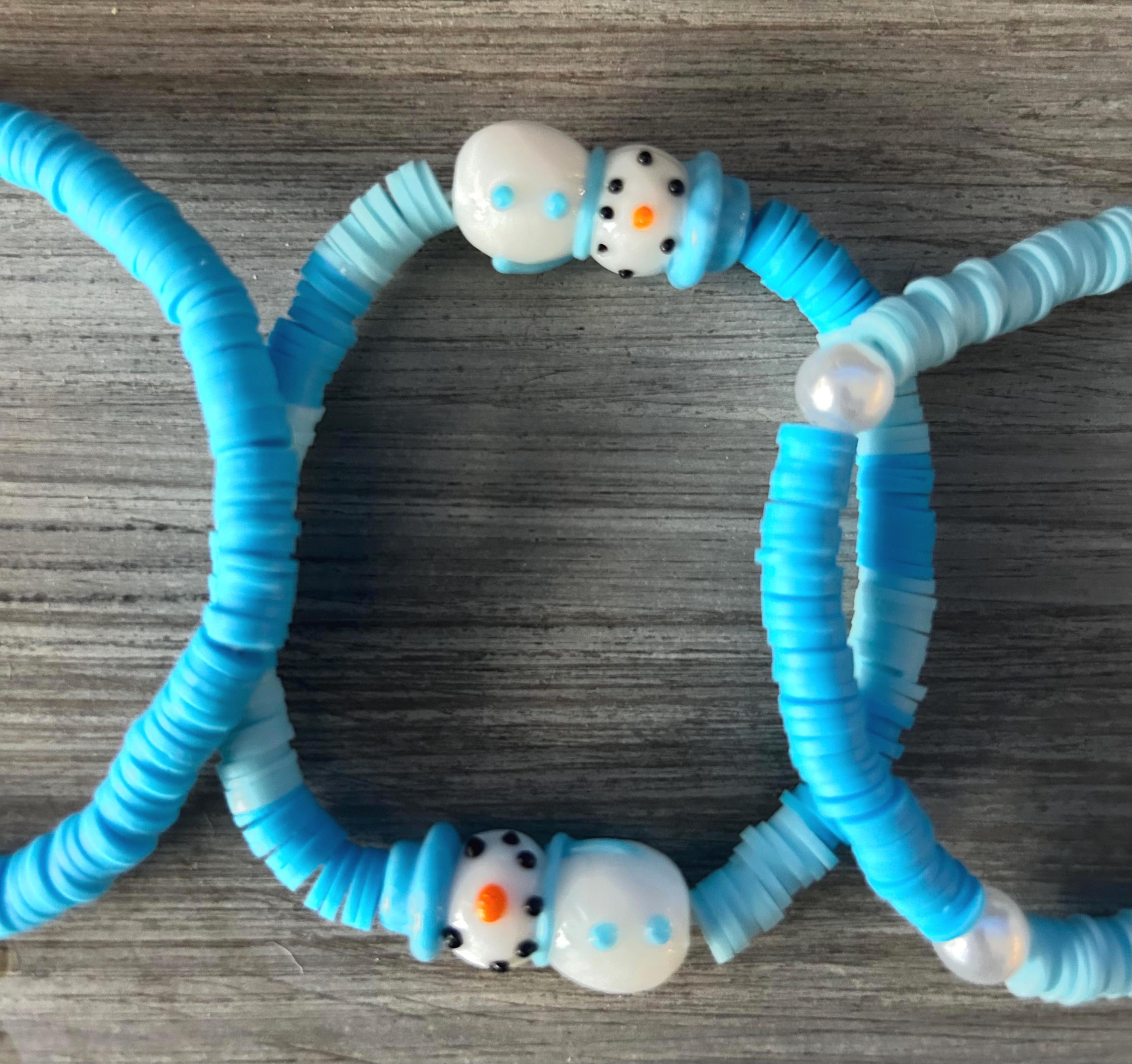Cute winter accessory to celebrate the holidays and snowy winter months! Made with heshi beads, glass snowman, plastic white pearls and strong elastic string. Fits comfortably. Size 7 inch is shown in pictures. Perfect stocking stuffer or Secret Santa gift!!!