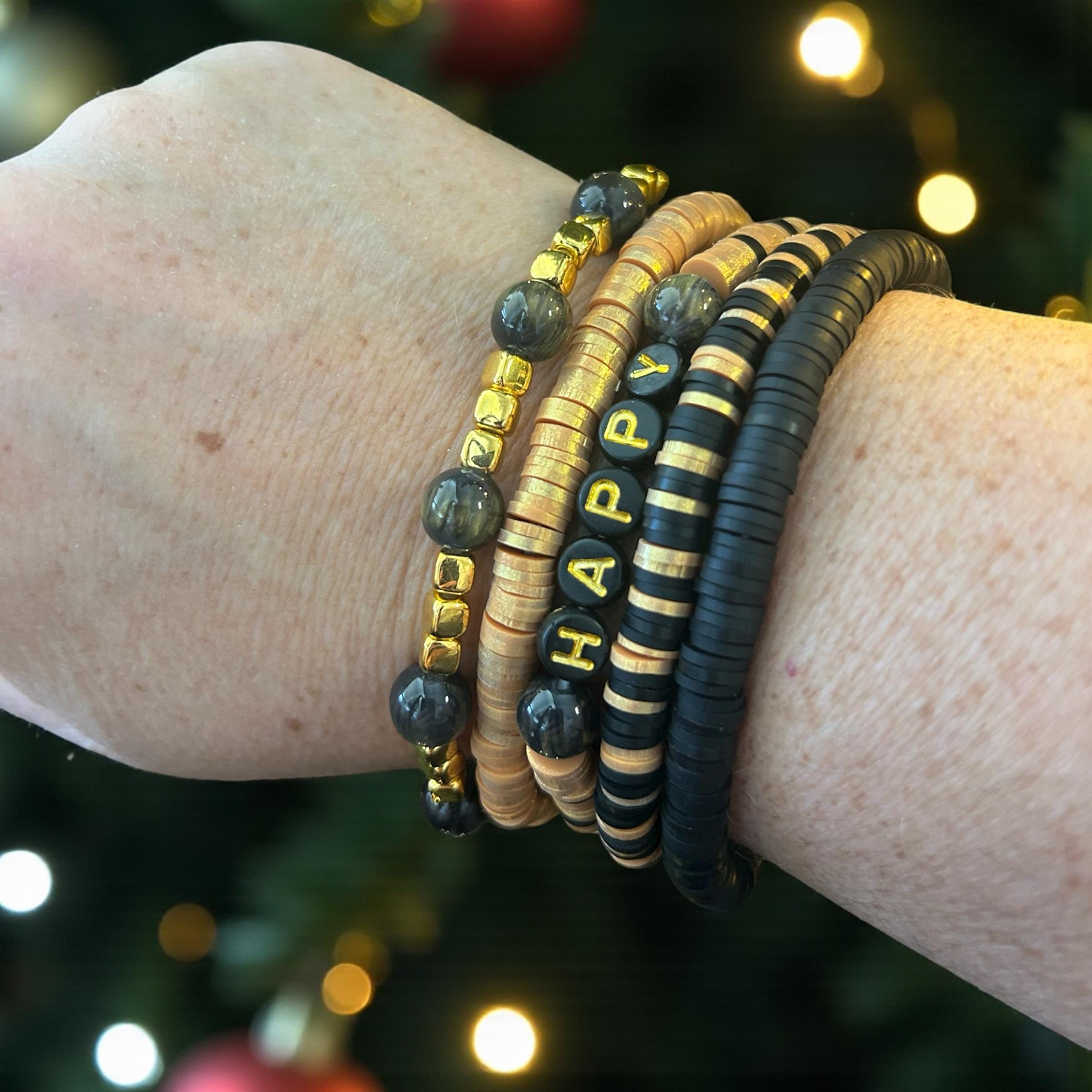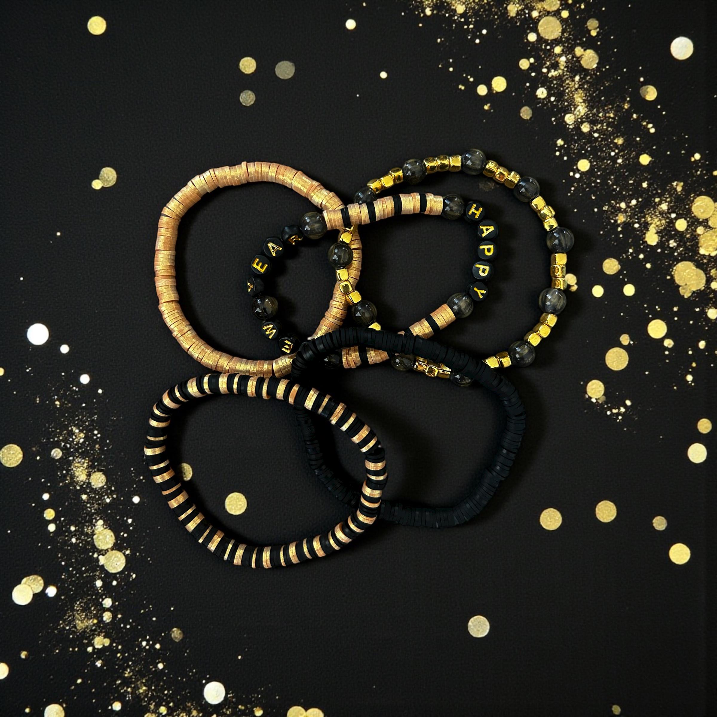 Gold and Black New Year bracelet set. Made with Heshi beads, glass gold/black beads, gold letter beads and gold spacers. Pictured is a 7 inch bracelet set that is loose and comfortable for all the New Year parties. Perfect holiday gift or to add to your party stash.