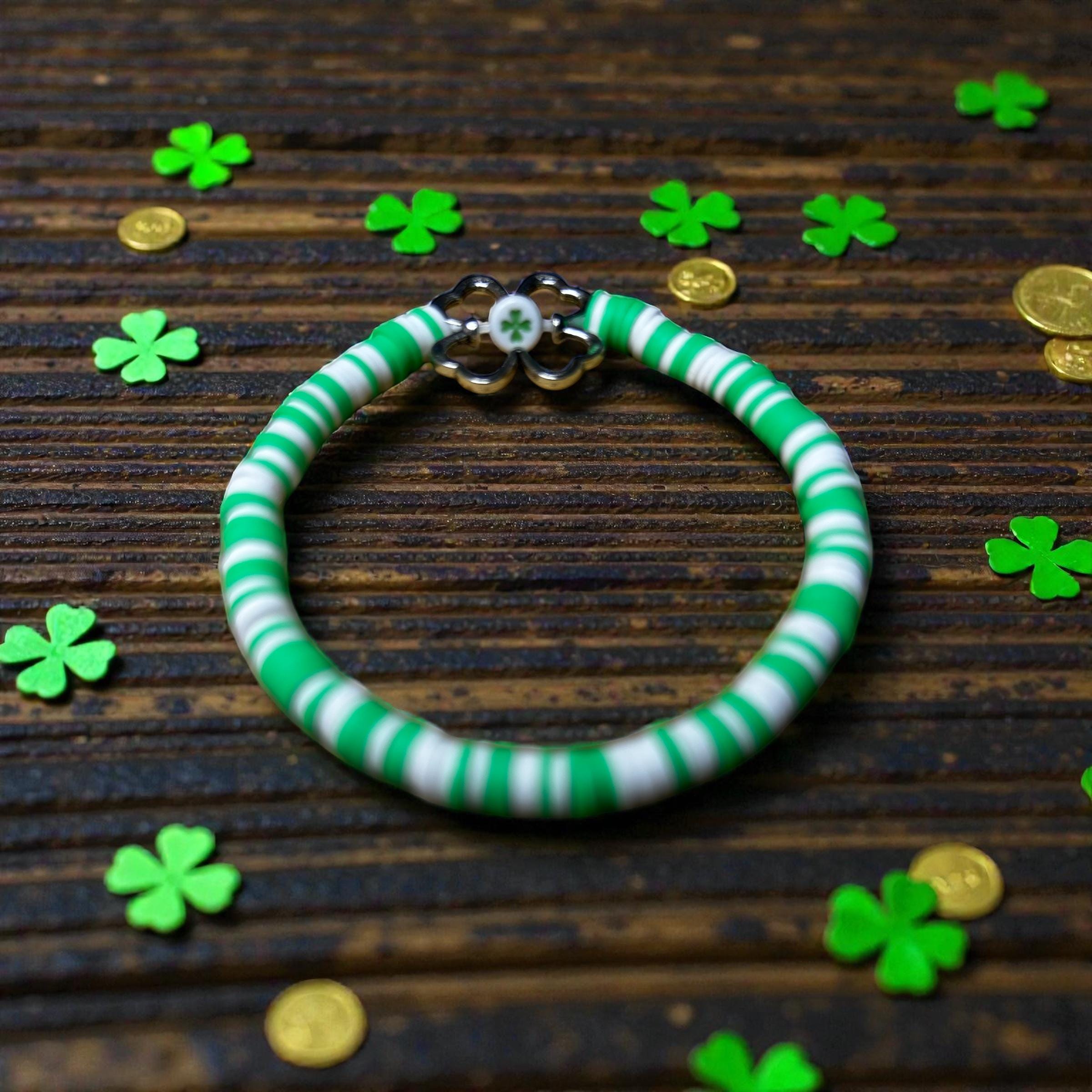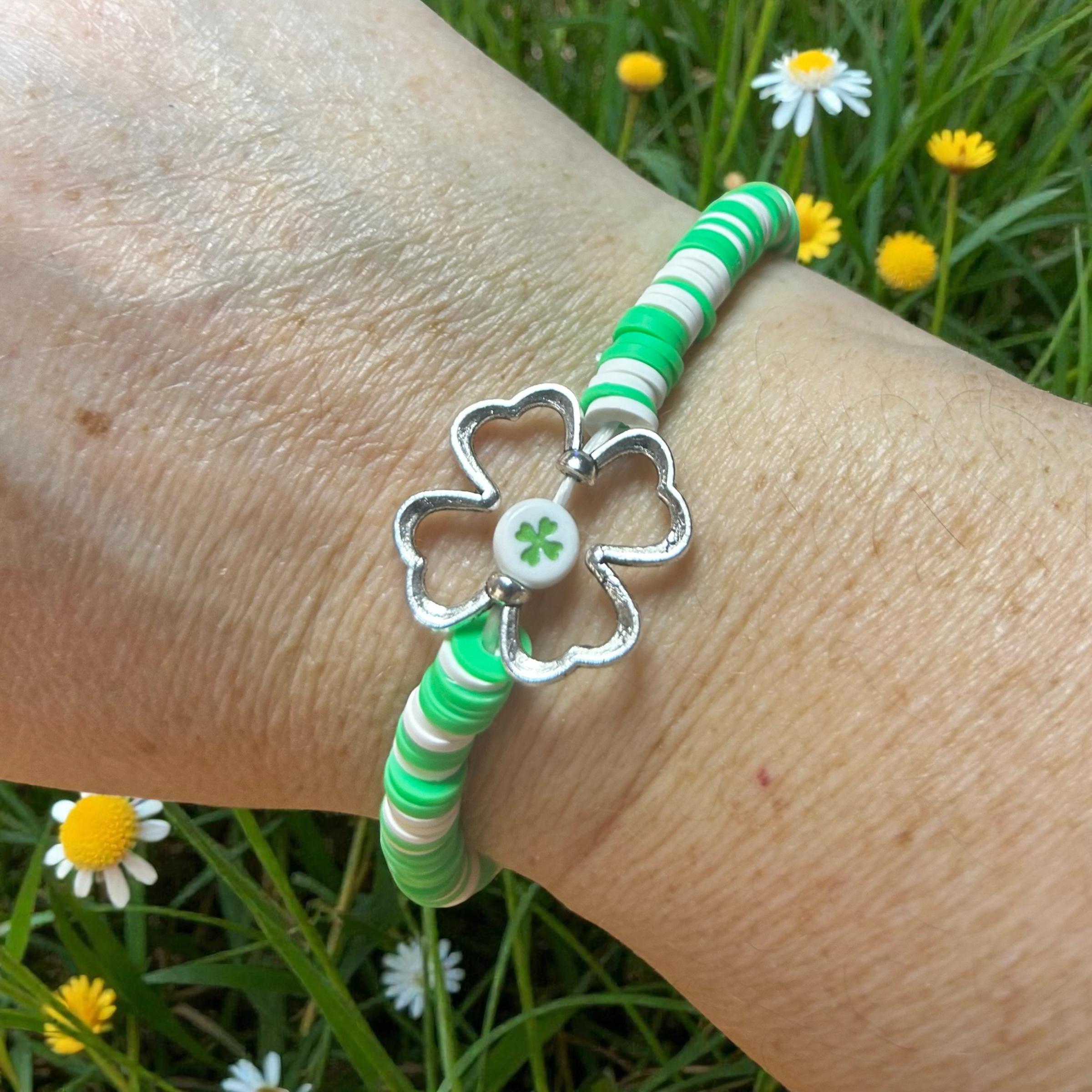 Shamrock beaded bracelet. Cute loose comfortable fit for a St. Patricks Day party or just to add to your stash!*gently handle bracelet*do not pull or stretch bracelet*roll bracelet on and off wrist